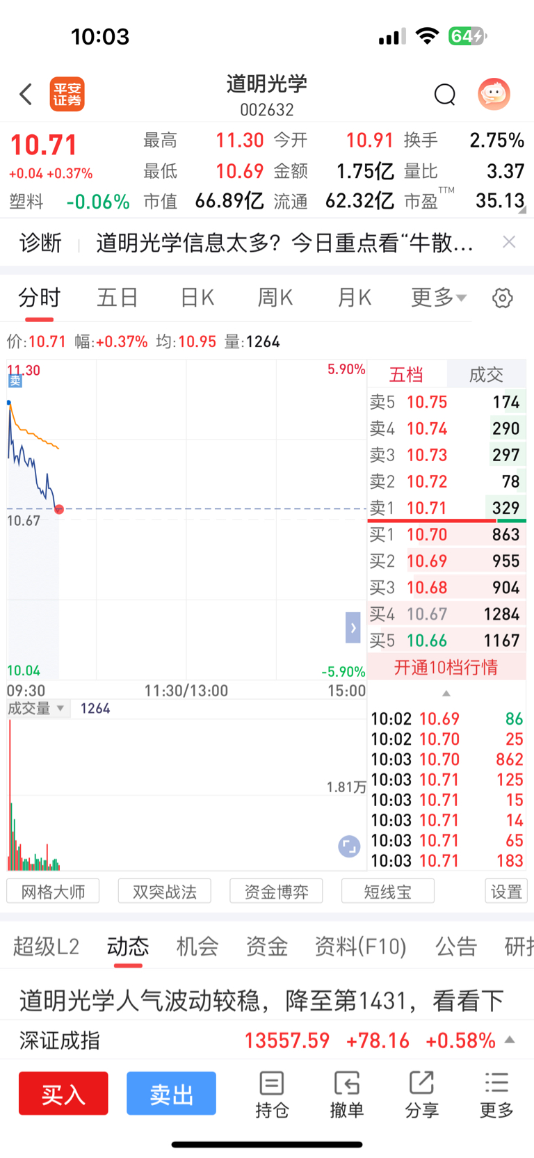 $道明光学(SZ002632)$ 昨天尾盘最后一分钟买的,早上一冲高马上卖