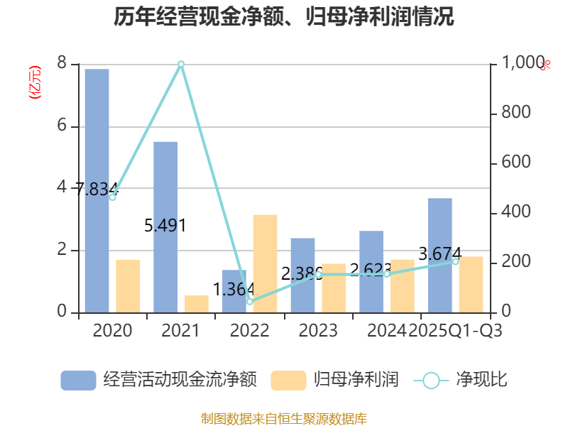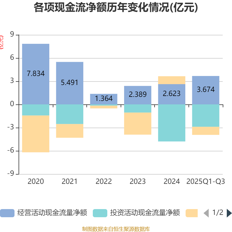 2025年前三季度,公司经营活动现金流净额为3.67亿元,同比增长150.26%;筹资活动现金流净额-1.04亿元,同比减少9690.28万元;投资活动现金流净额-2.9亿元,上年同期为-9676.03万元。