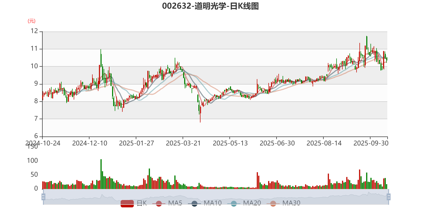 中证智能财讯道明光学(002632)10月24日披露2025年第三季度报告。前三季度公司实现营业总收入11.02亿元,同比增长7.24%;归母净利润1.8亿元,同比增长24.69%;扣非净利润1.63亿元,同比增长27.26%;经营活动产生的现金流量净额为3.67亿元,同比增长150.26%;报告期内,道明光学基本每股收益为0.2874元,加权平均净资产收益率为8.24%。