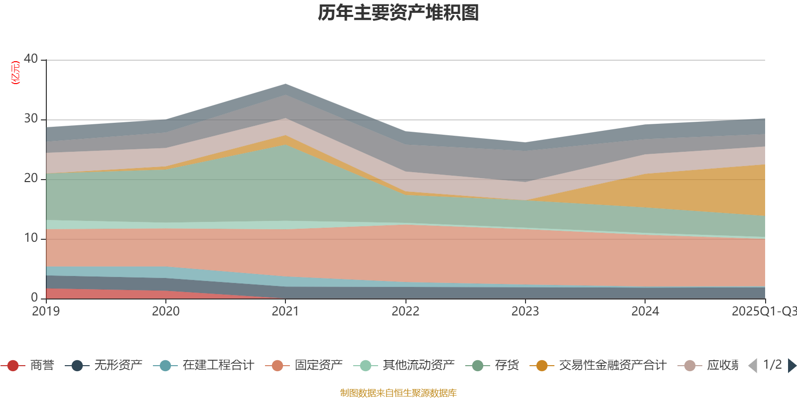 资产重大变化方面,截至2025年三季度末,公司交易性金融资产合计较上年末增加53.31%,占公司总资产比重上升9.32个百分点;固定资产较上年末减少8.39%,占公司总资产比重下降3.4个百分点;存货较上年末减少17.51%,占公司总资产比重下降2.97个百分点;货币资金较上年末减少18.87%,占公司总资产比重下降1.9个百分点。