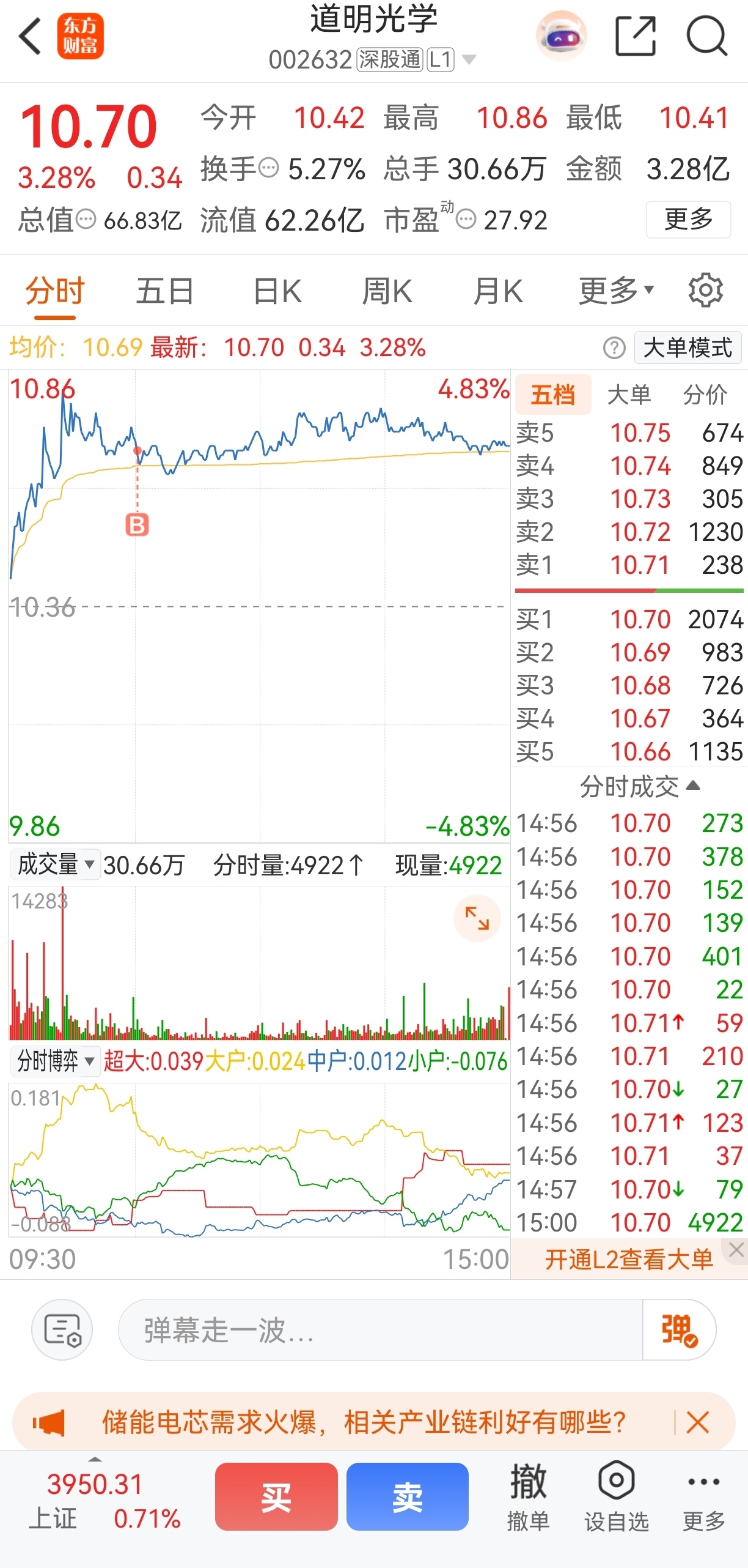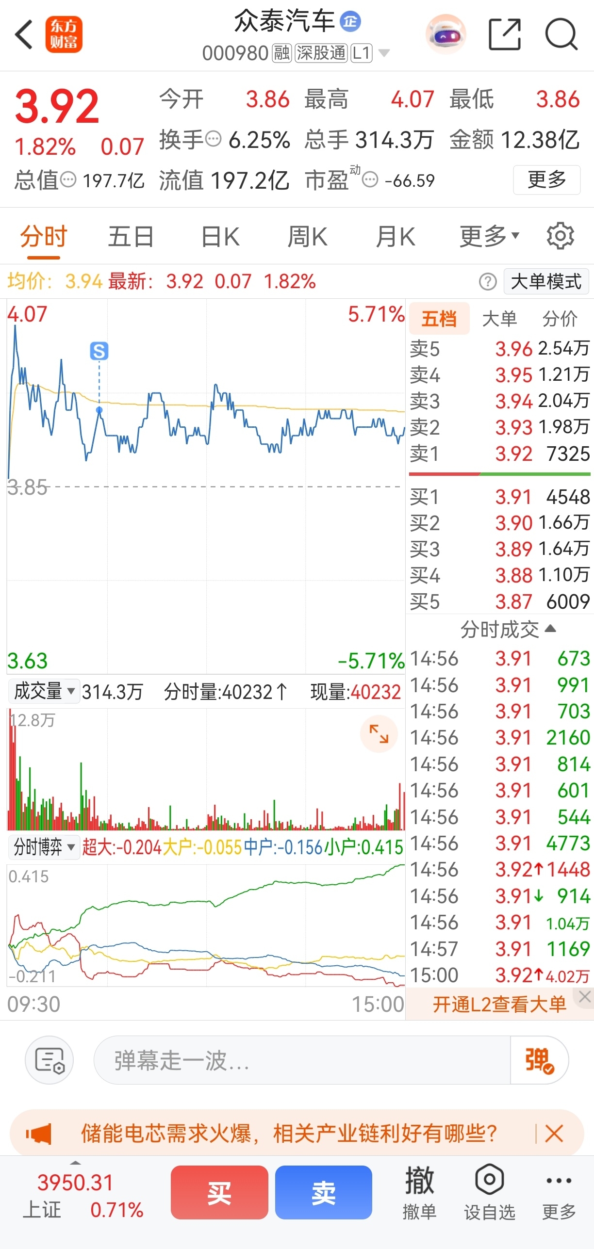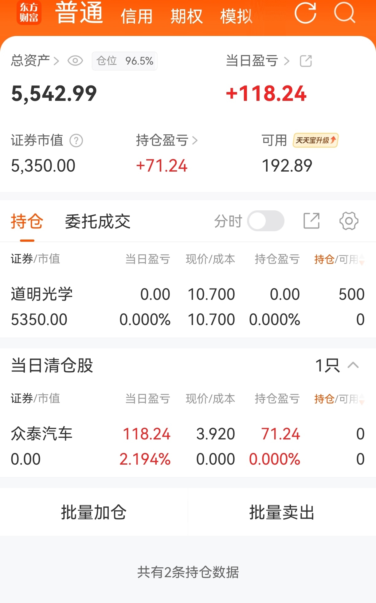 控制回撤才是稳定盈利最重要的因素,一直告诉自己要忌贪,忌急,见好就收,一点点来,可是一直做不到。$众泰汽车(SZ000980)$ 在第一波冲高跌破均线后内心就告诉自己再次拉升的时候就卖出,但是等他再次拉升的时候已经挂单3.99了,但是还是贪心太重撤单了。买入$道明光学(SZ002632)$ 也是偏防守,现在不能追求暴利了,先让账户不继续暴跌就好,道明下周一应该还是有溢价的。