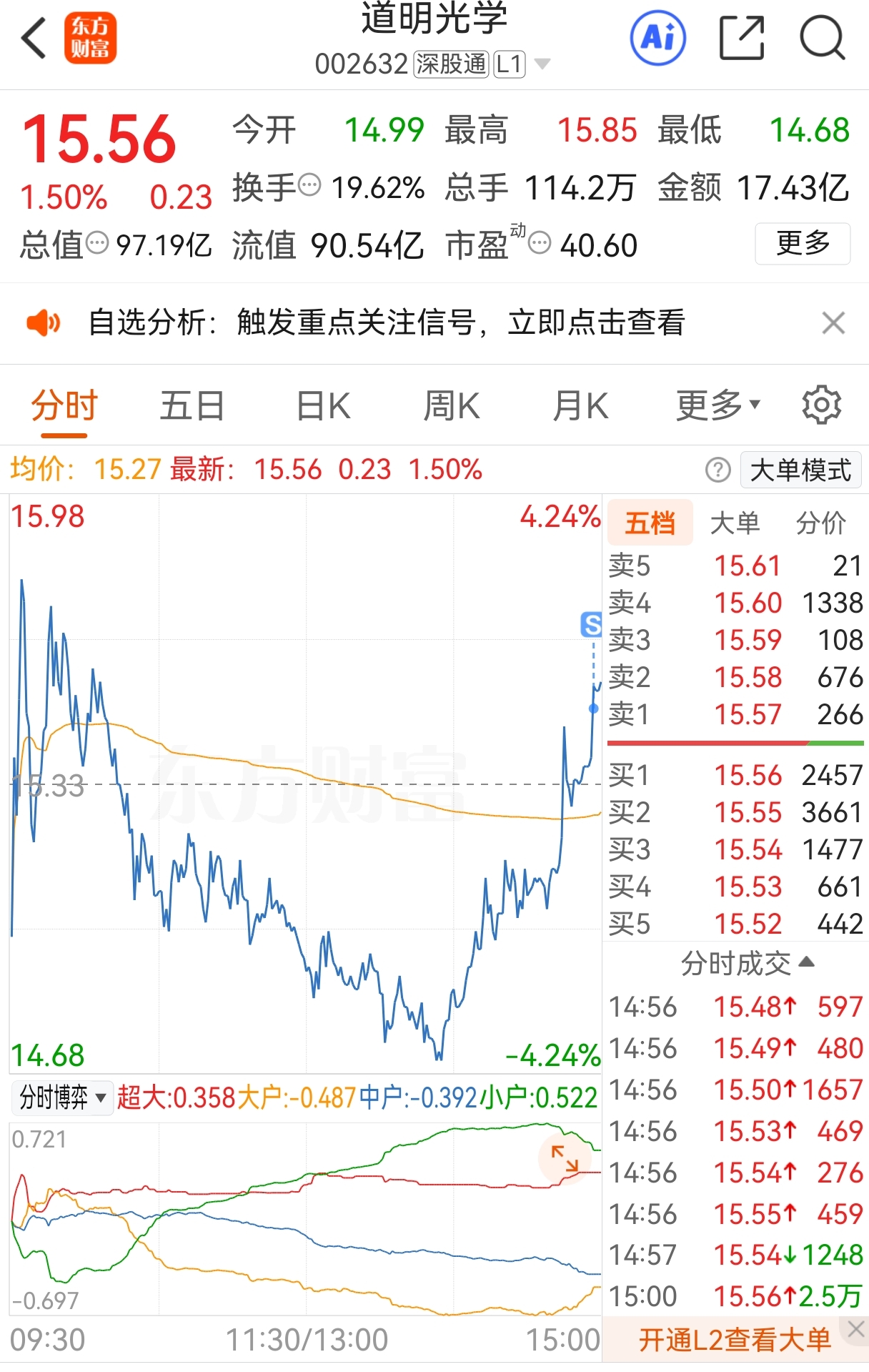 $道明光学(SZ002632)$ 15.5但愿是我卖飞了,留下的兄弟发财
