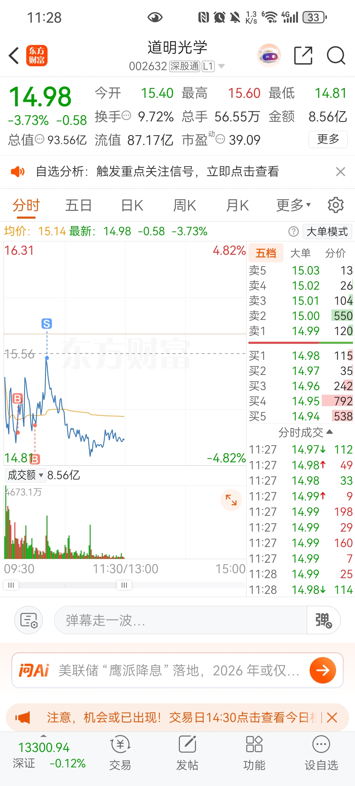 $道明光学(SZ002632)$ 明天不长就清仓
