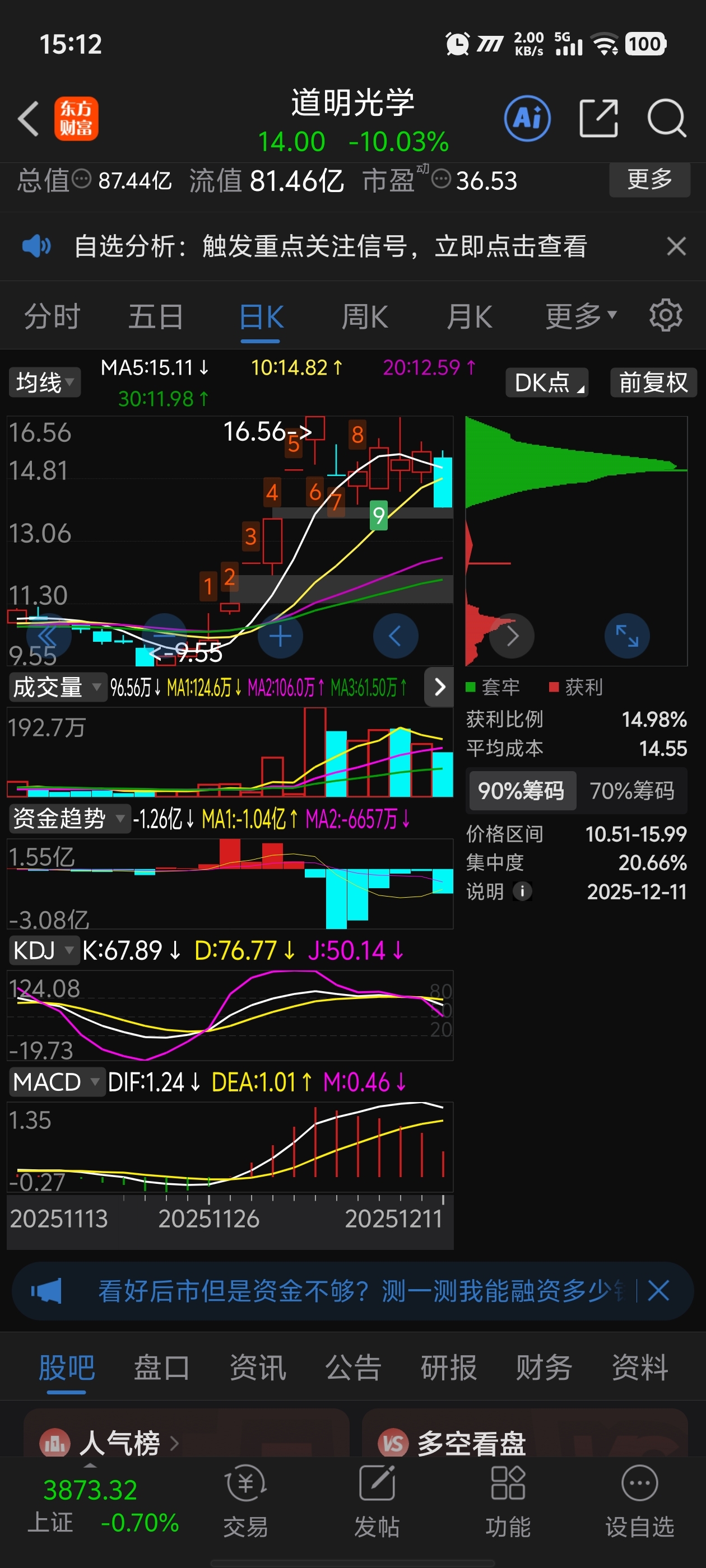 $道明光学(SZ002632)$ 上面全部套牢了,下个月能解套