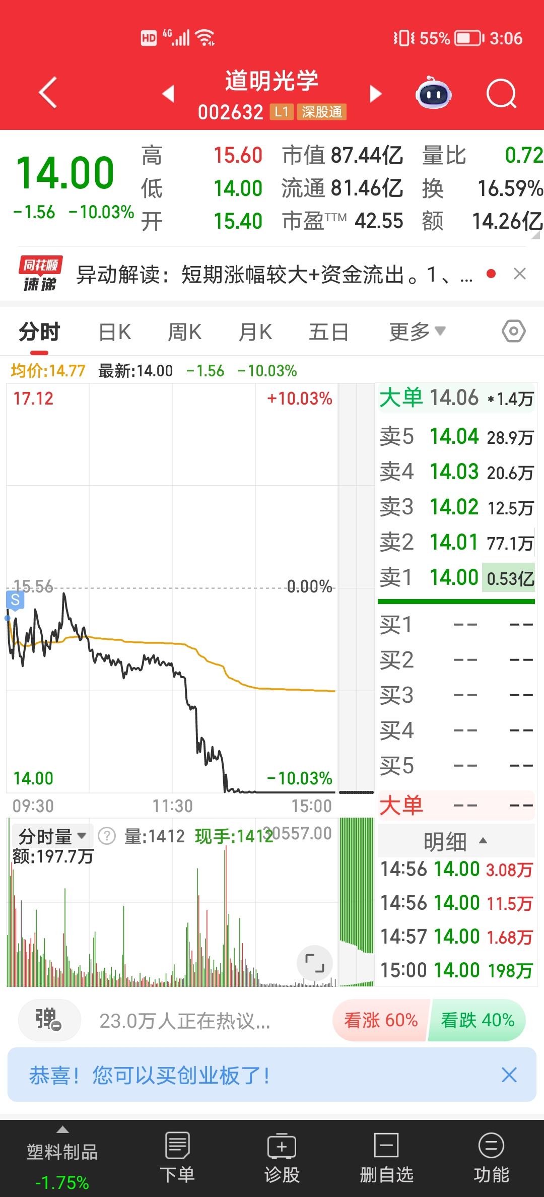 $道明光学(SZ002632)$ 开盘10分钟就-4,真是考研手速,不然又是一碗面。