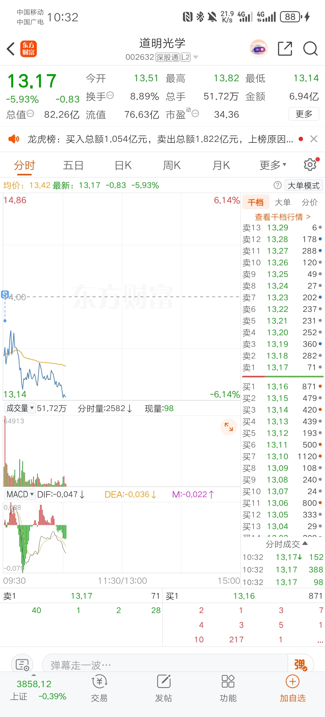 $道明光学(SZ002632)$ 原本赚10个点,最后赚了1个点。哎,昨天接了个跌停出来。删自选