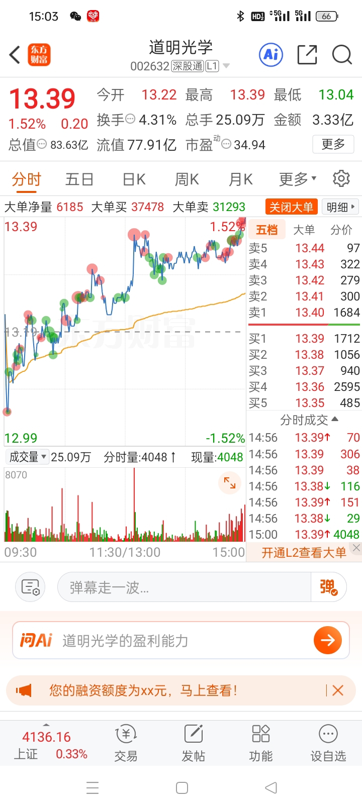 $道明光学(SZ002632)$ 绩优股。超级主力下午13:07分大单扫货。尾盘扫货。一浪高过一浪。走出三阳开泰。红三兵。上方抛压很轻了。主力高度控盘。今日5日均线上穿10均线。多头炮。日线。周线。月线。共振。满仓买入。稳赚不赔。
