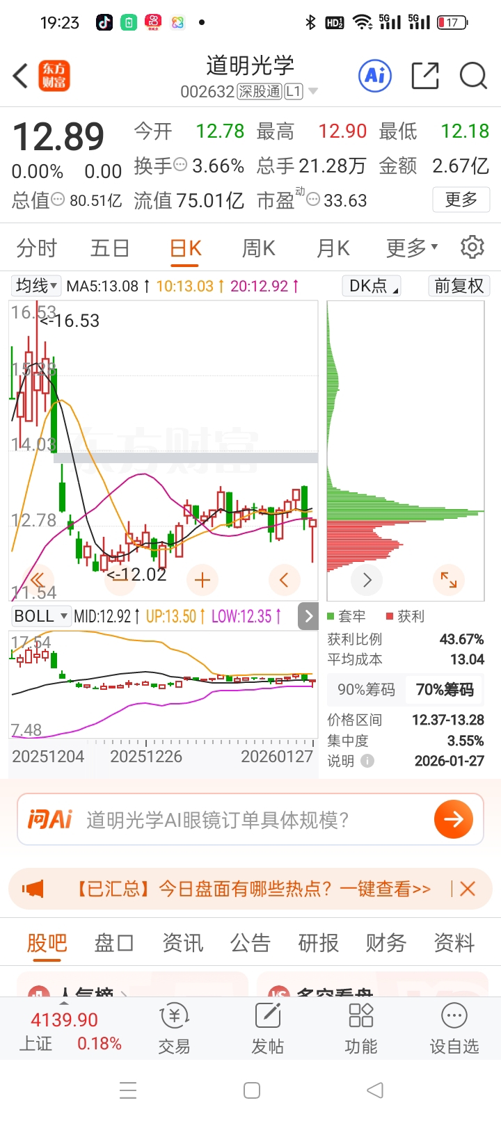 $道明光学(SZ002632)$ 绩优股。Al手机,华为概念。新材料石墨烯散热膜,太阳能,锂电池,固态电池。反光膜与海外30多个国合作。现金流3.764亿。有无人机反光镜头。长腿美女K线形态。单针探底成功。布林线下轨强支撑。明天旭日东升K线形态。黄金坑,满仓买入。稳赚不赔。