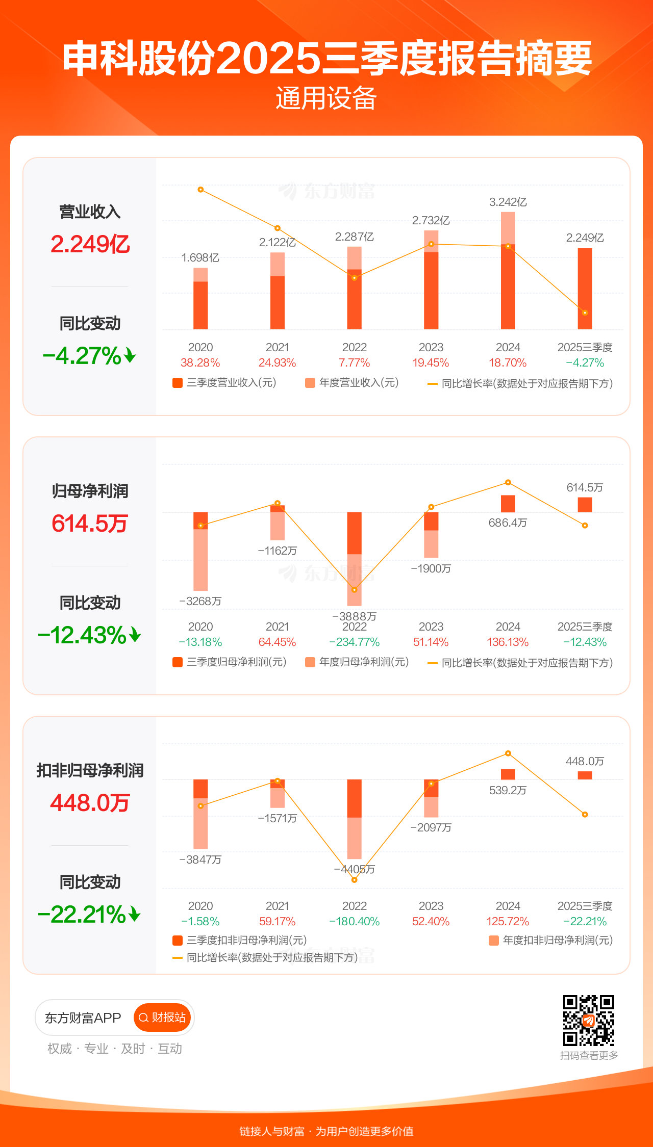 申科股份10月31日发布2025年三季报显示,公司前三季实现营业收入2.25亿元,同比下滑4.27%;归母净利润614.53万元,同比下滑12.43%;扣非归母净利润447.97万元,同比下滑22.21%。