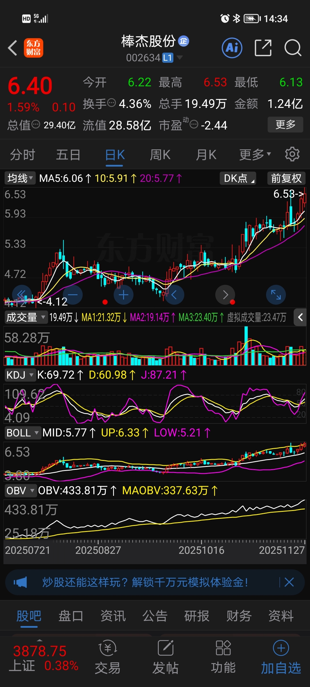 $棒杰股份(SZ002634)$ 庄家可以动一动啦,明日来个涨停板,3131.今天收个中量阳线,141319.3199
