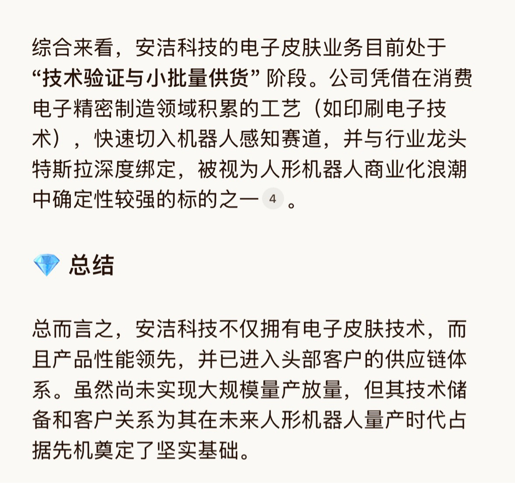 $安洁科技(SZ002635)$ 电子皮肤 安洁科技 (002635.SZ)通过柔性压力传感器阵列切入电子皮肤领域,其核心技术基于压阻式传感原理,通过在聚酰亚胺(PI)薄膜上印刷碳纳米管导电油墨,构建可拉伸的导电网络。柔性压力传感器可实现0.1kPa级压力灵敏度和0.1mm级形变分辨率,并已通过特斯拉Optimus Gen2版本的送样测试。