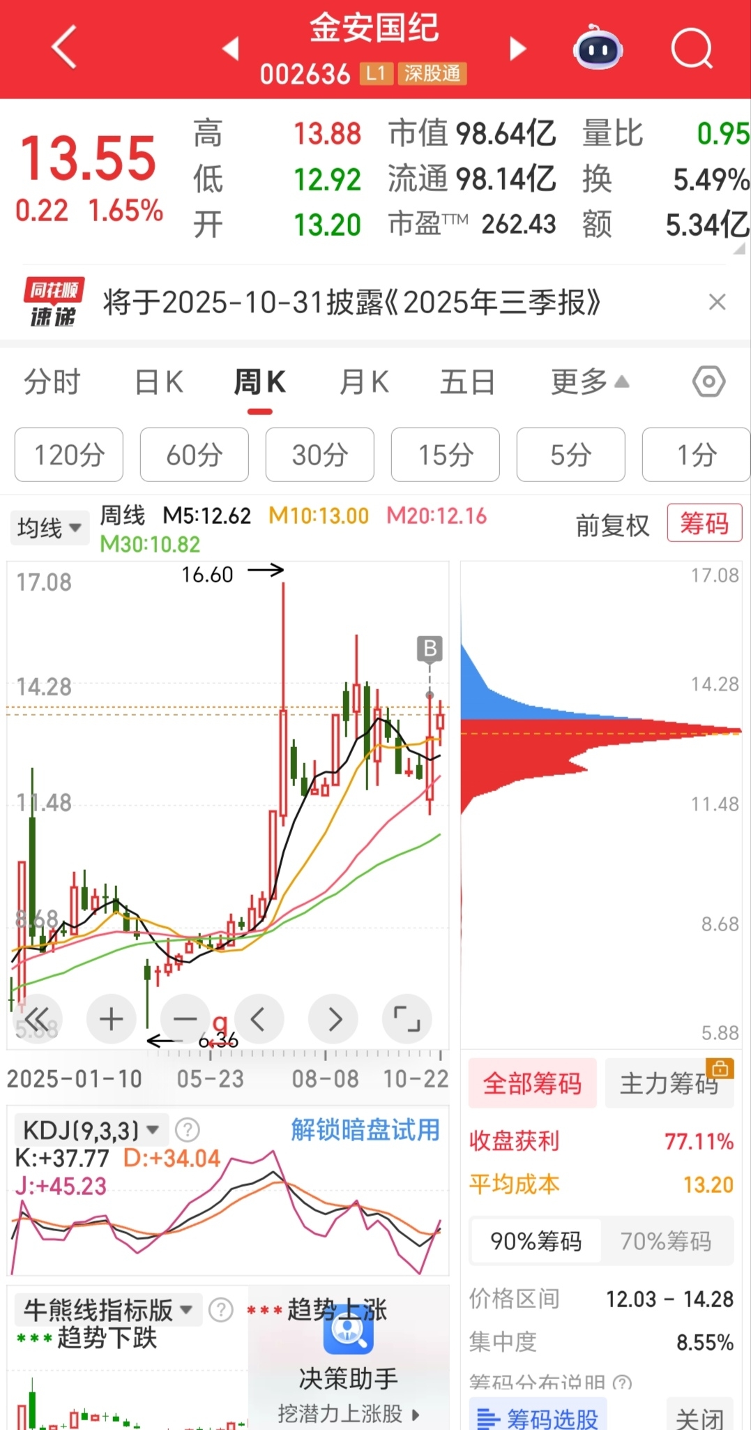 $金安国纪(SZ002636)$ 周K,峰尖较上周转锐利,峰身也规整些。
