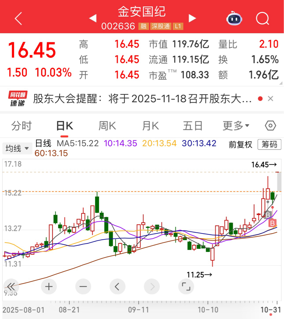 $金安国纪(SZ002636)$ 前天建仓,昨天补,今天板,还可以哦哈