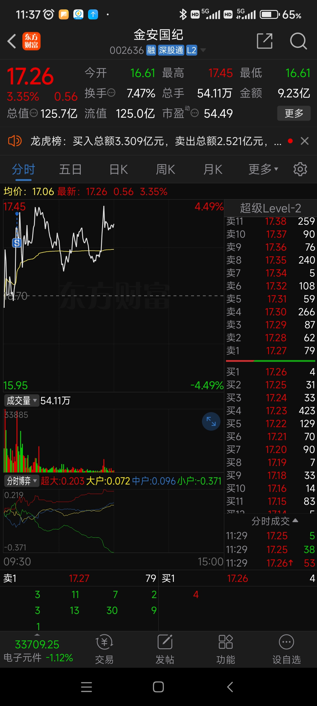 $金安国纪(SZ002636)$ 昨天16.91买的,早上冲高17.34跑了,骨头上舔了点味知足了,感谢不杀之恩。但不得不说,我卖了的通常稍候涨停的,本月已经两次了,现在看着它主力资金在流入,真的可能又是这样,下午估计又拍大腿了。