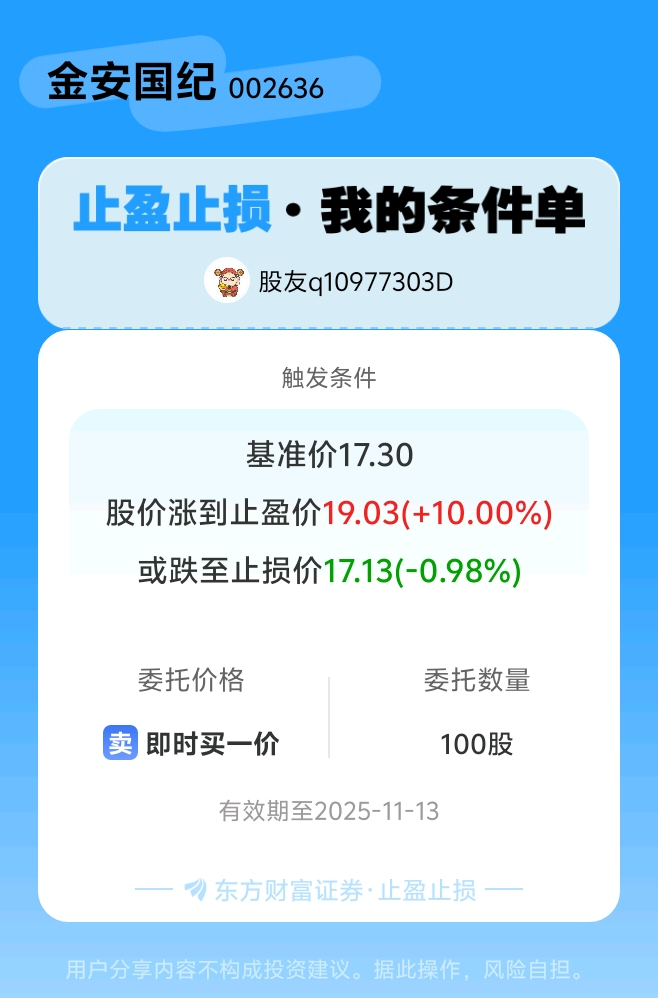 #条件单交流# #止盈止损晒单# 一位股神设置了一个止盈止损条件单,接下来就是见证奇迹的时刻~$金安国纪(SZ002636)$