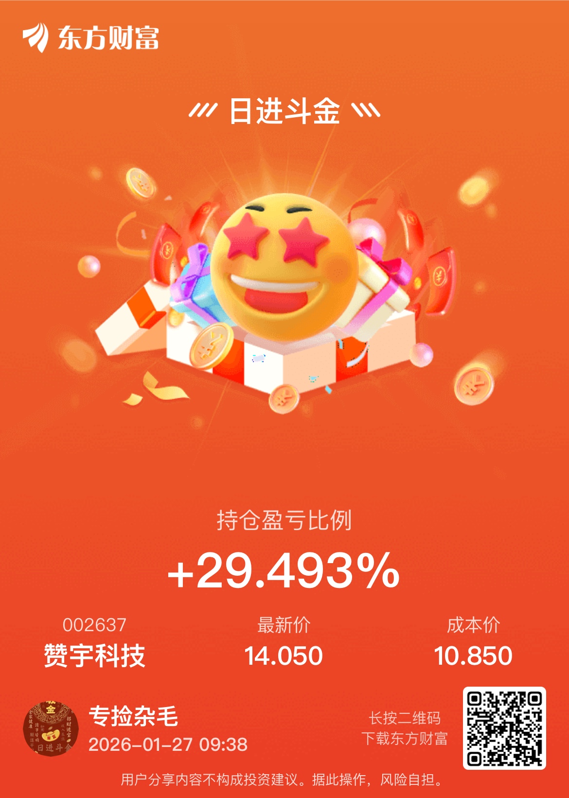温馨提示: 1.根据《证券法》规定,禁止编造、传播虚假信息或者误导性信息,扰乱证券市场;2.用户在本社区发表的所有资料、言论等仅代表个人观点,与本网站立场无关,不对您构成任何投资建议。用户应基于自己的独立判断,自行决定证券投资并承担相应风险。《东方财富社区管理规定》