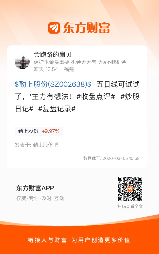 $勤上股份(SZ002638)$  五日线可试试了,'主力有想法!#收盘点评#  #炒股日记#  #复盘记录#