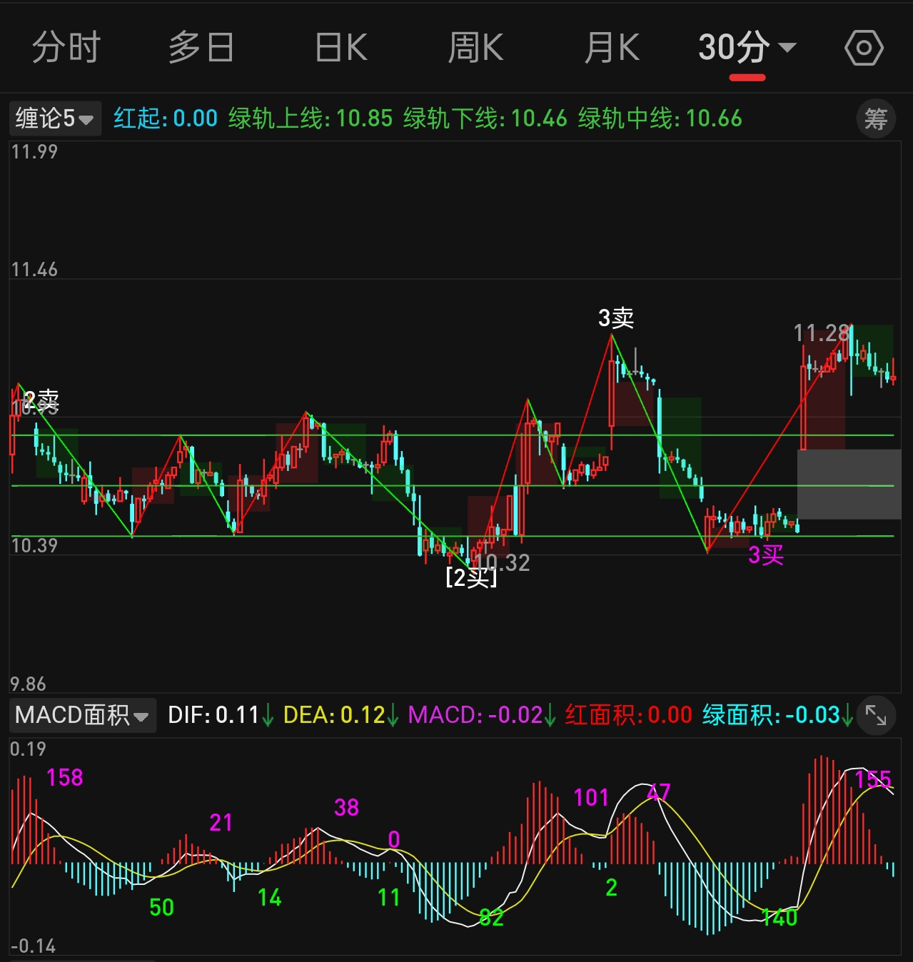 30分钟这一笔还没到位,拜一还要再向下走一走。只要回踩不破10.85就是比较强势