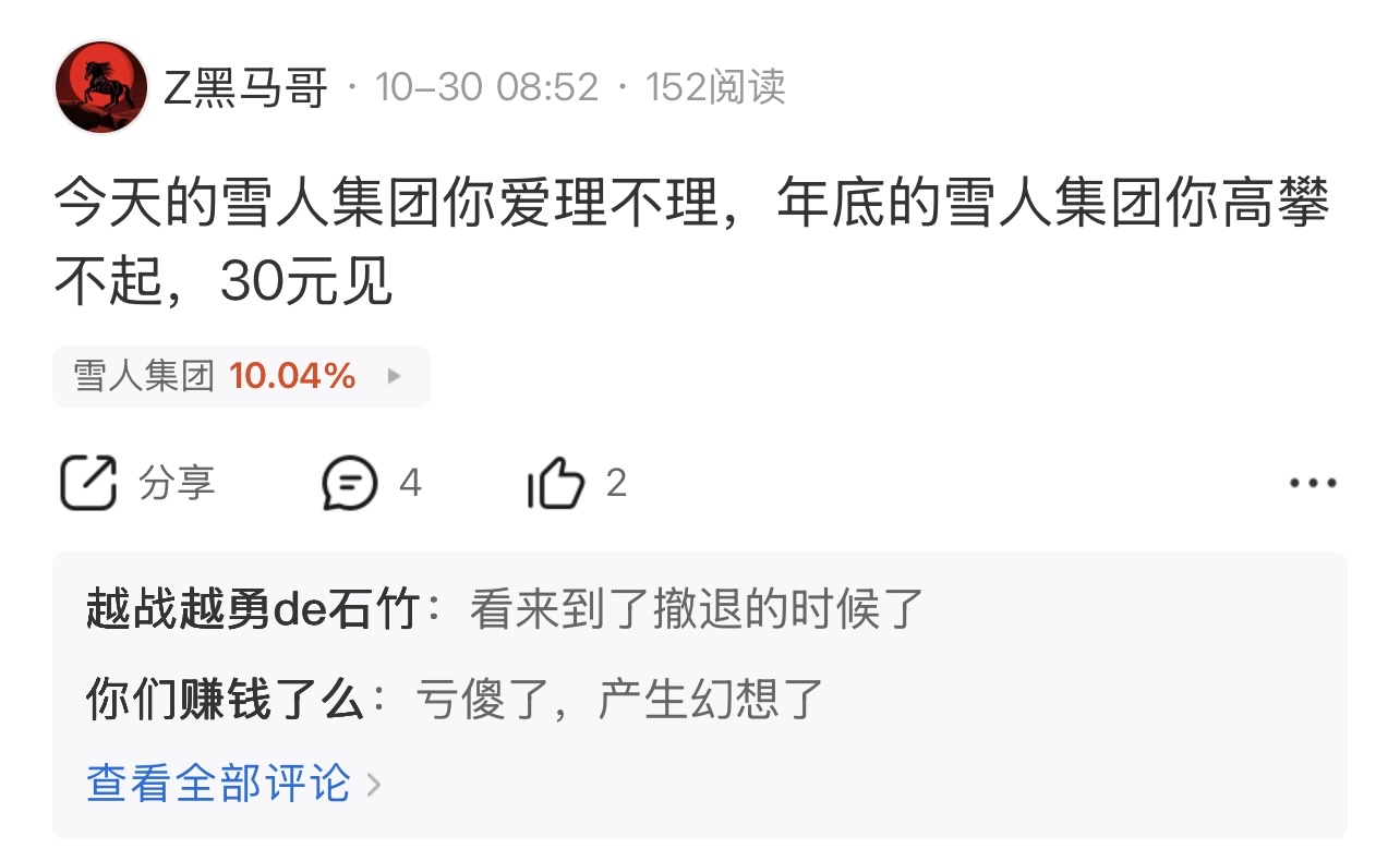 $雪人集团(SZ002639)$ 10月30号骂我的那一批人呢????给你机会不中用啊