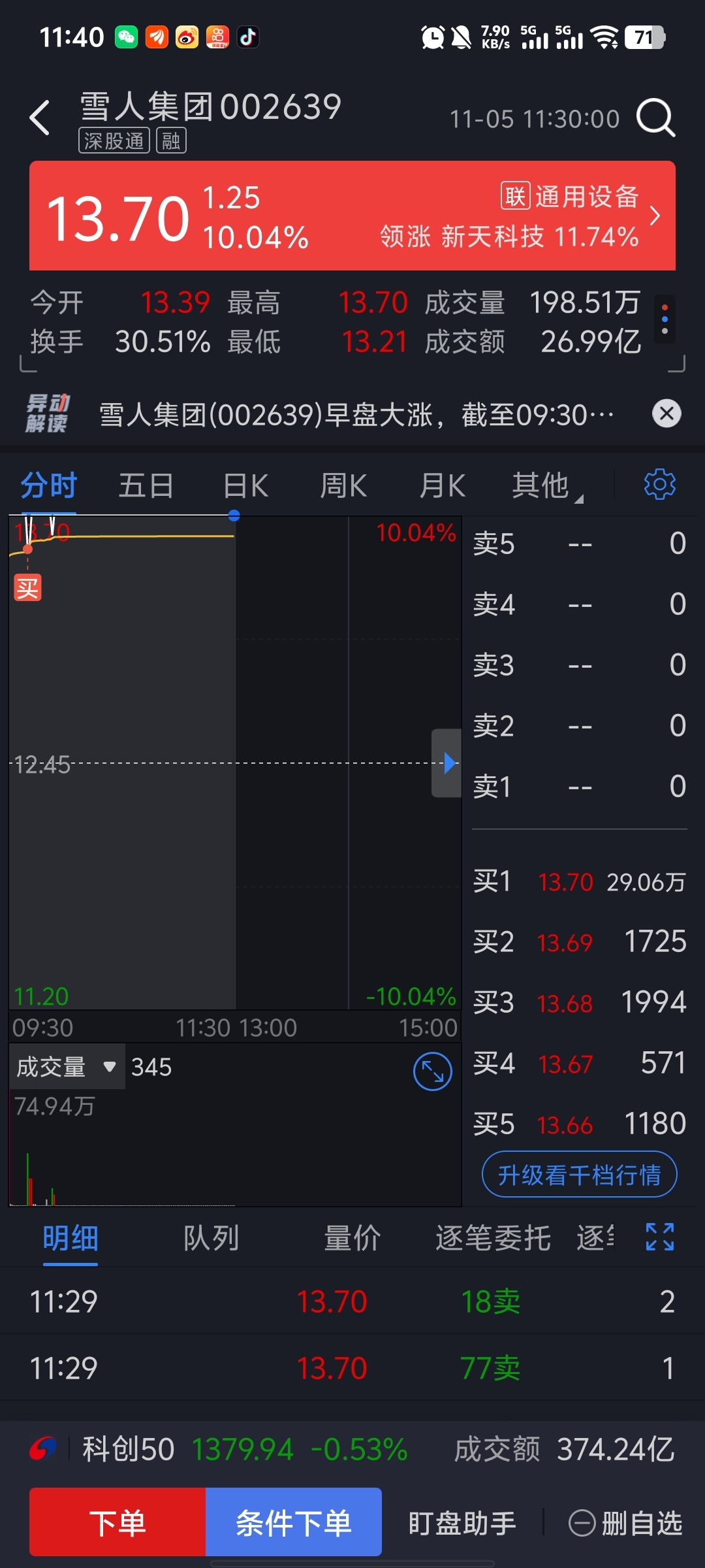 $雪人集团(SZ002639)$ 今天盯盘刚好看到你开门,冲进来了