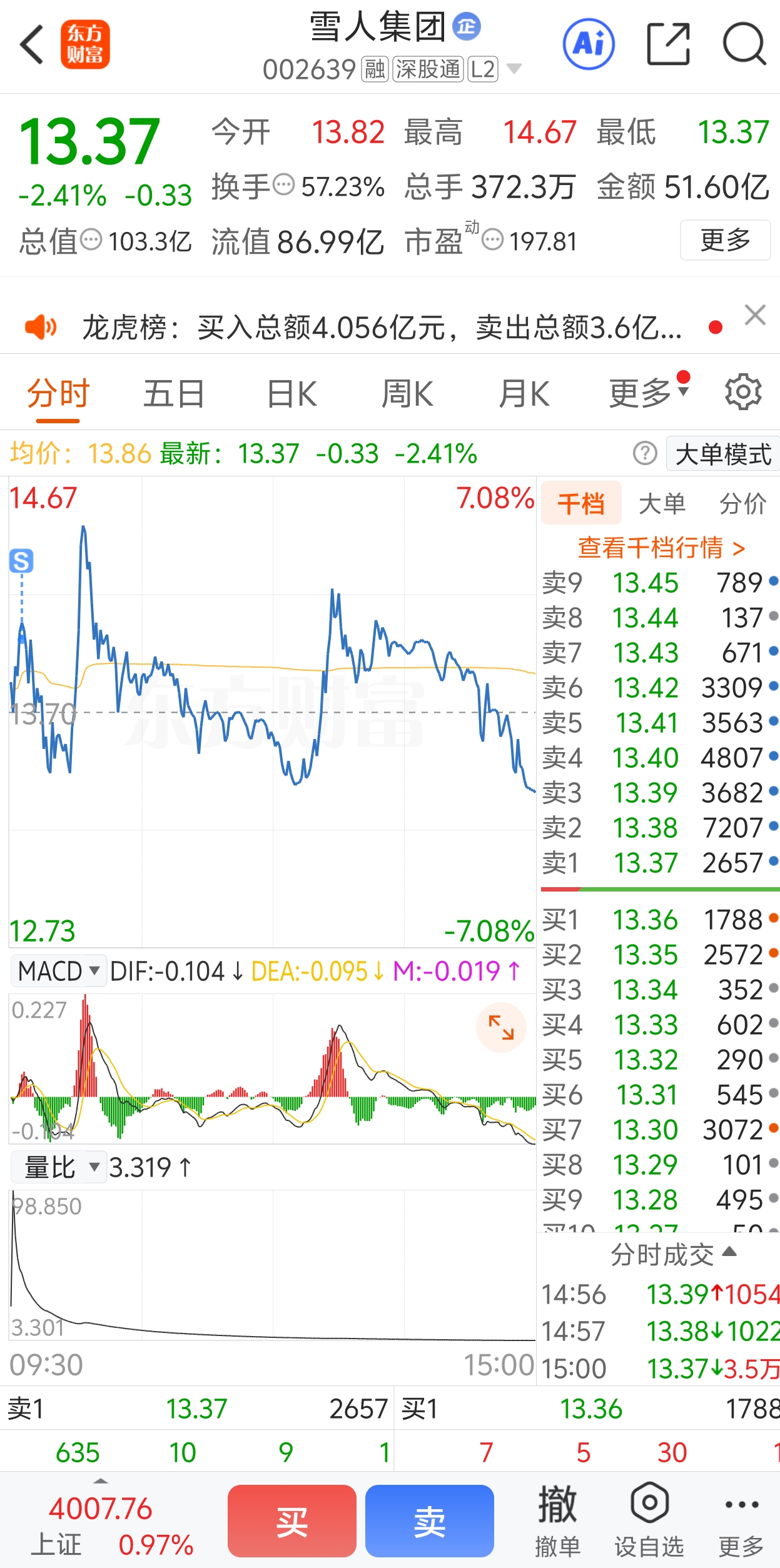 $雪人集团(SZ002639)$ 昨天开盘竞价本来挂半仓卖的,挂成了买进。阴差阳错今天14清仓了