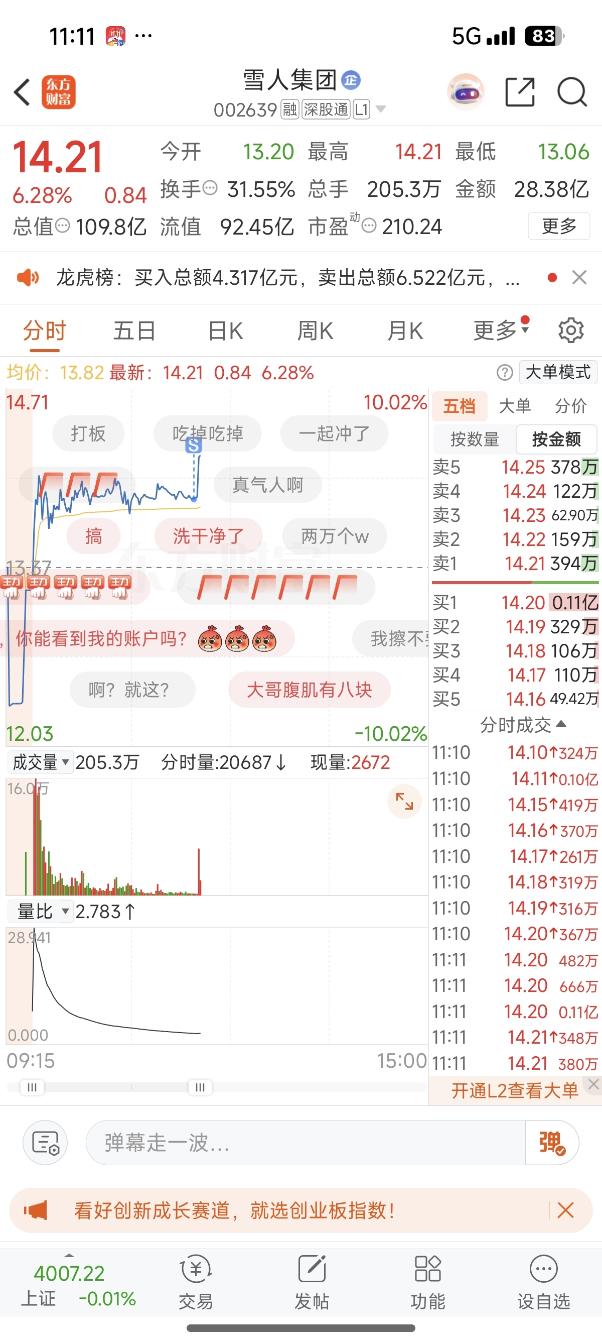 $雪人集团(SZ002639)$ 非得我走你才拉升嘛?就差这一分钟?