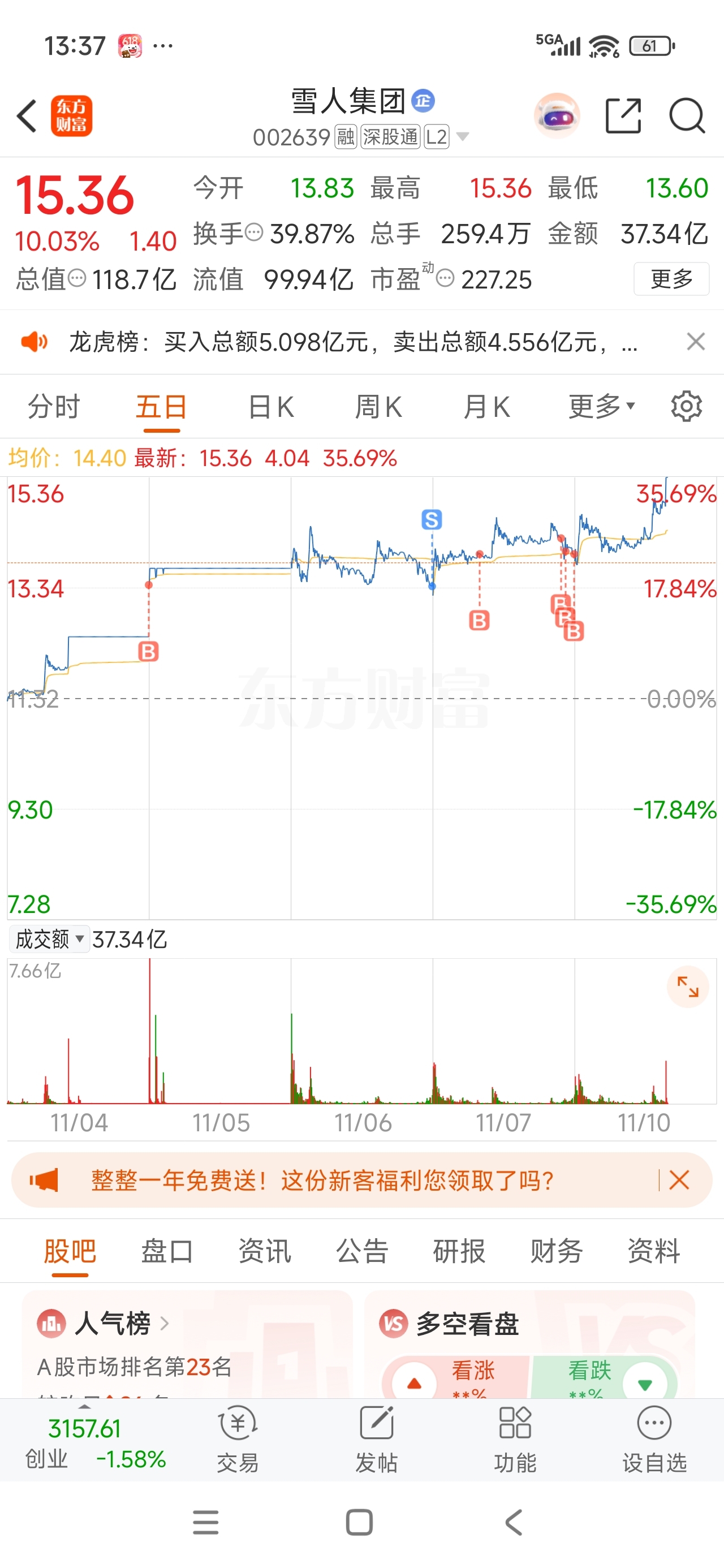 $雪人集团(SZ002639)$ 韭菜一个操作,卖飞一半