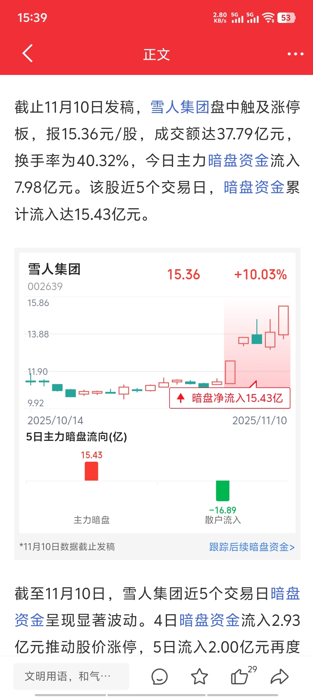 $雪人集团(SZ002639)$ 五天流入15个亿,今天就一半7个多亿,看看到底什么搞头