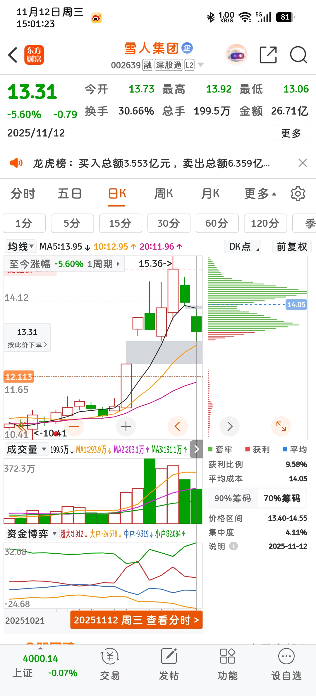 $雪人集团(SZ002639)$ 这筹码峰也是6,套了这么多人,底部的都卖的差不多了。目前主力成本估计也在13左右了
