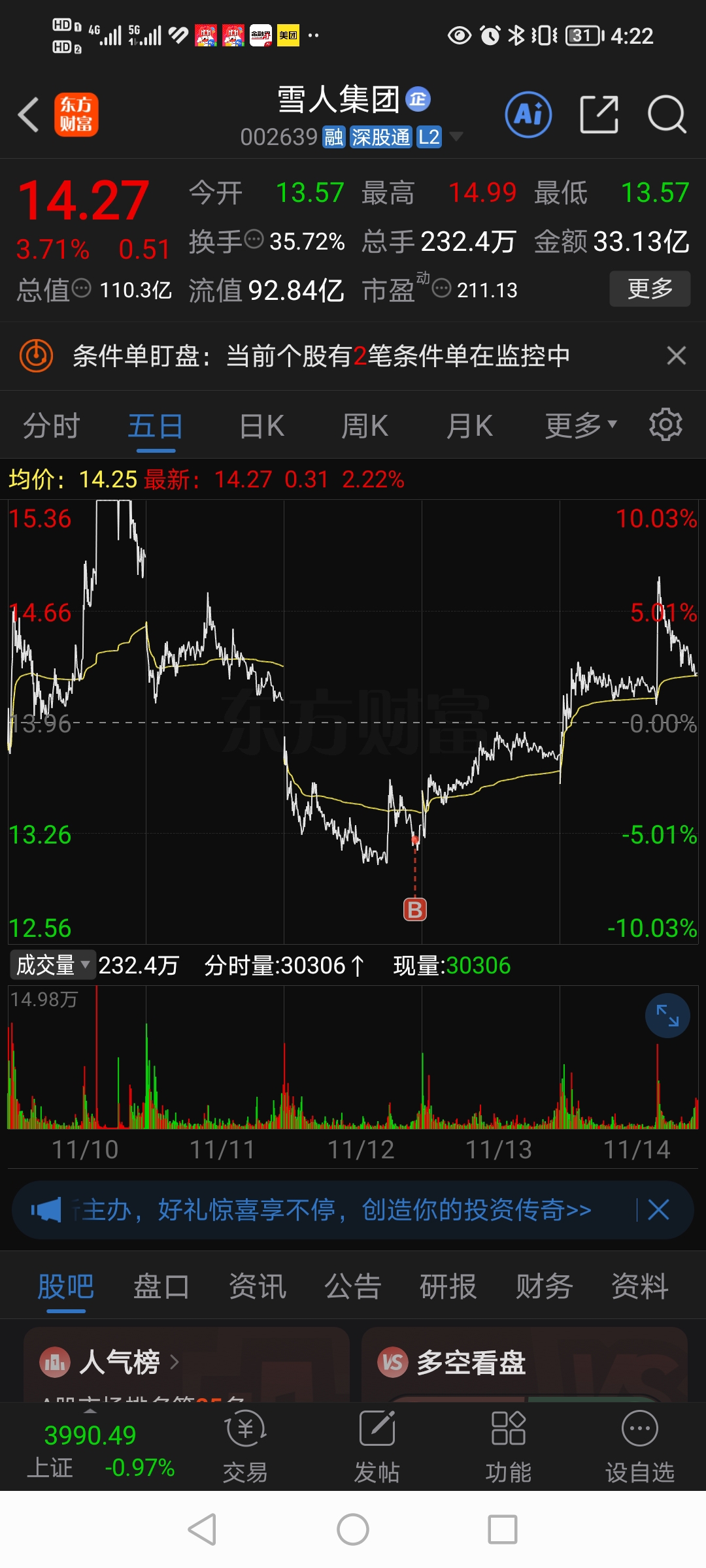 $雪人集团(SZ002639)$ 没高抛利润回撤比较多