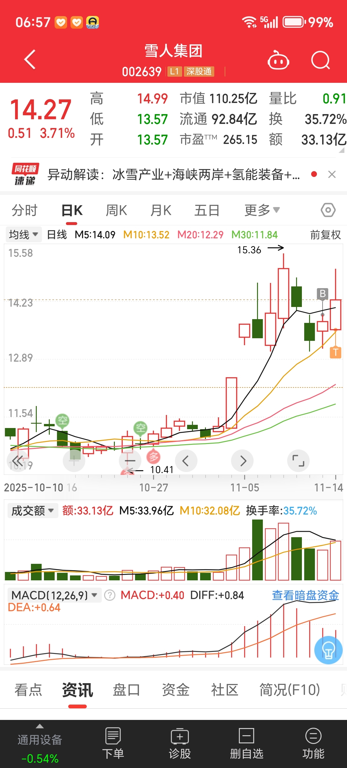$雪人集团(SZ002639)$ 位置是不低了但是盘整5个多月突破的,突破完每天的换手和量太猛了,说明有大资金进出,今天看如果高位个股炸了的反馈怎么样吧,然后在决定怎么操作吧,还是那句话散户别慌要做跟随,10日线不破先拿着吧破了要注意减一些,做倒t就好了,应该差不多吧。
