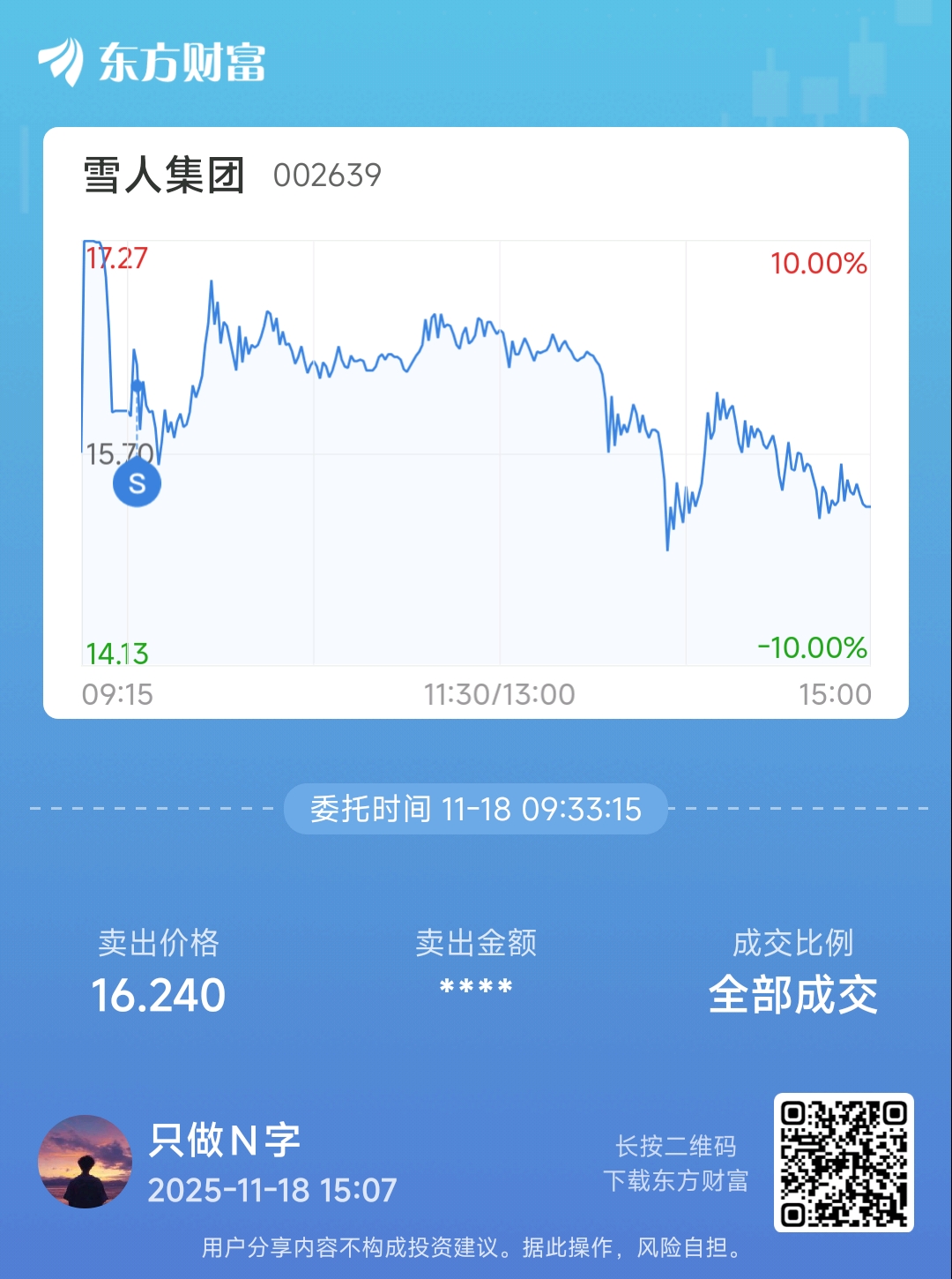 $雪人集团(SZ002639)$ 市场教会我的,赚了就跑,千万不要贪,昨天一个涨停板,今天3.5卖了,吃了13个点,满足了