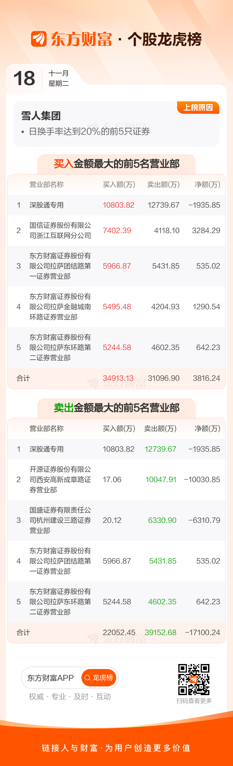 交易所2025年11月18日公布的交易公开信息显示,雪人集团因成为日换手率达到20%的前5只证券上榜。雪人集团当日收报15.3元,涨跌幅-2.55%,偏离值50.12%,换手率50.33%,成交额52.65亿。
