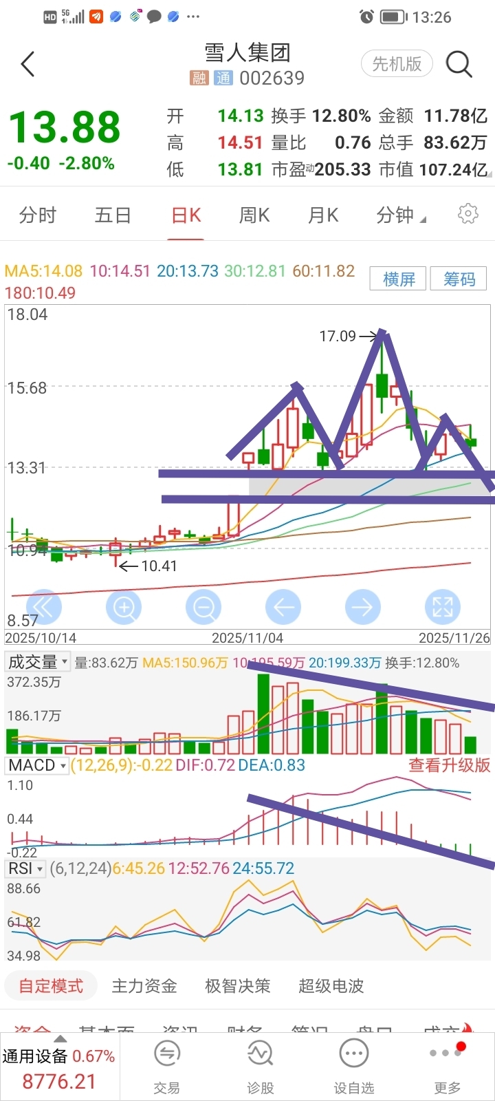 一哥看盘:雪人走势相当差劲,量能与股价完全靠背离,macd目前绿柱还不够,应该会