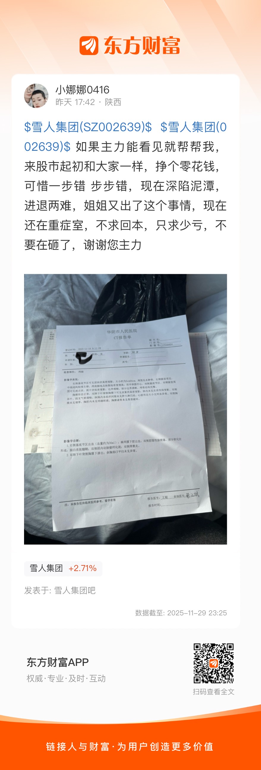 $雪人集团(SZ002639)$ $雪人集团(002639)$ 如果主力能看见就帮帮我,来股市起初和大家一样,挣个零花钱,可惜一步错 步步错,现在深陷泥潭,进退两难,姐姐又出了这个事情,现在还在重症室,不求回本,只求少亏,不要在砸了,谢谢您主力