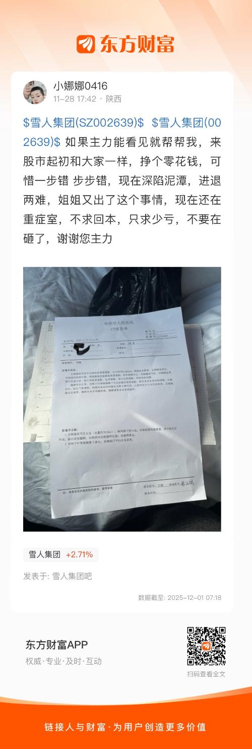 $雪人集团(SZ002639)$ $雪人集团(002639)$ 如果主力能看见就帮帮我,来股市起初和大家一样,挣个零花钱,可惜一步错 步步错,现在深陷泥潭,进退两难,姐姐又出了这个事情,现在还在重症室,不求回本,只求少亏,不要在砸了,谢谢您主力