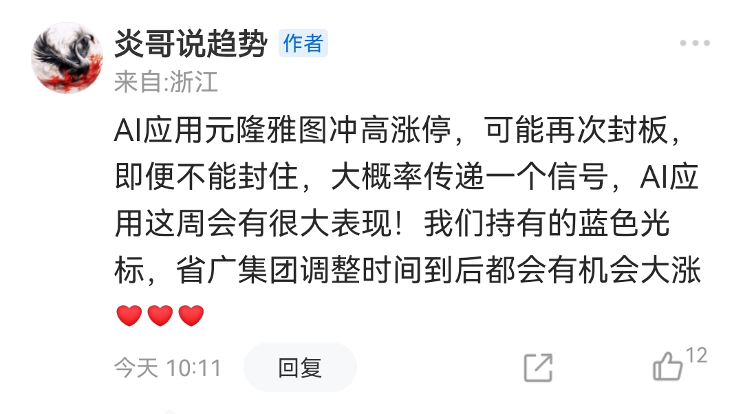 谷子经济概念也是AI应用端概念股,最近复盘和早盘炎哥对元隆雅图的走势做了预判,调整的空间是到了,但是时间还差点。空间到了就有反弹,时间未到只能延缓推迟,但不能再跌。今天的剧本差不多按照炎哥的预判再走,但大幅拉升冲板是没有料到的。