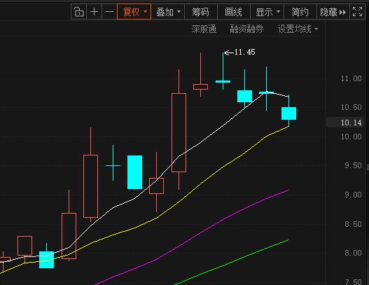 蓝标其实算起来调整第四天,第一个上吊线我们不算是调整开启,而以下个交易日来算,前三天基本都是横盘状态,且调整幅度都不大。今天是来个像样的调整,回踩了10日线。上升趋势中,回调到10日线后企稳是再正常不过。后市我们谨慎点来看,最多调整到上个平台上沿9.7元的位置,时间上明天再调一天,也有可能再磨,但明天要么企稳要么走弱,也就是说变盘窗口来临!