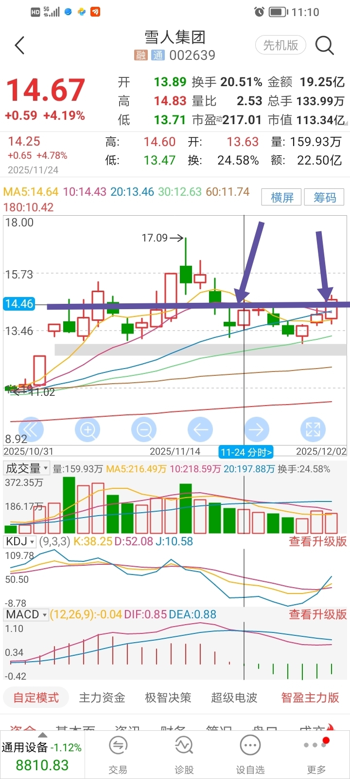 $雪人集团(SZ002639)$ 此处压力很大,今日主力偷袭摸到此处,必然回调,今日必出上影线,待明日再做定夺。