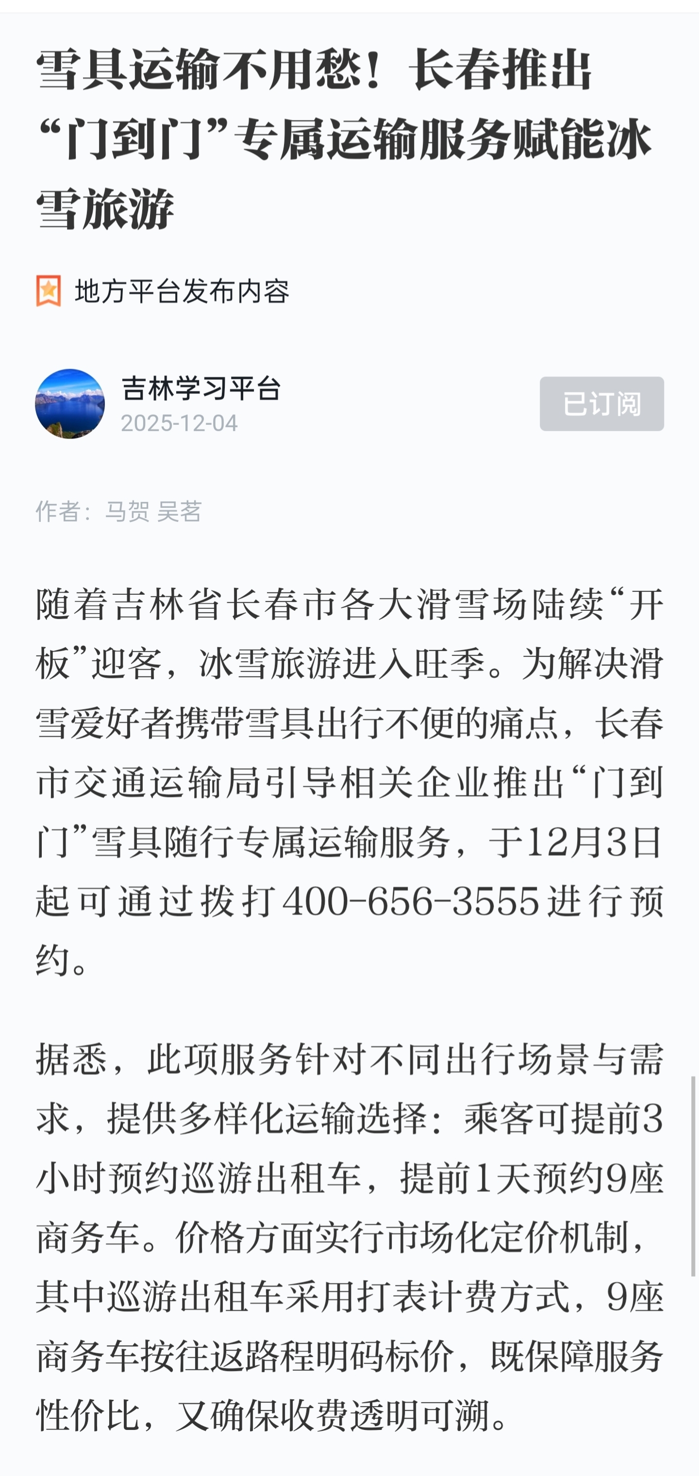 长春推出“门到门”专属运输服务赋能冰雪旅游!