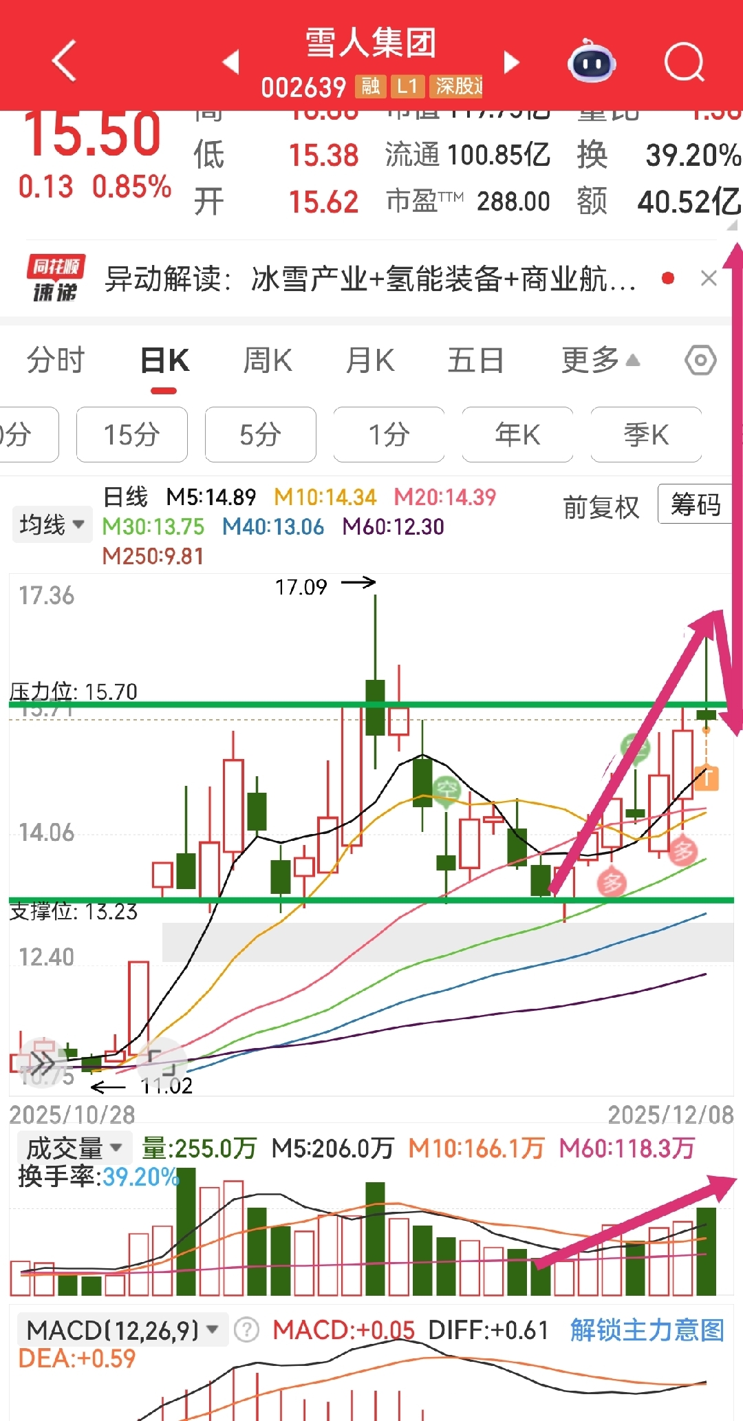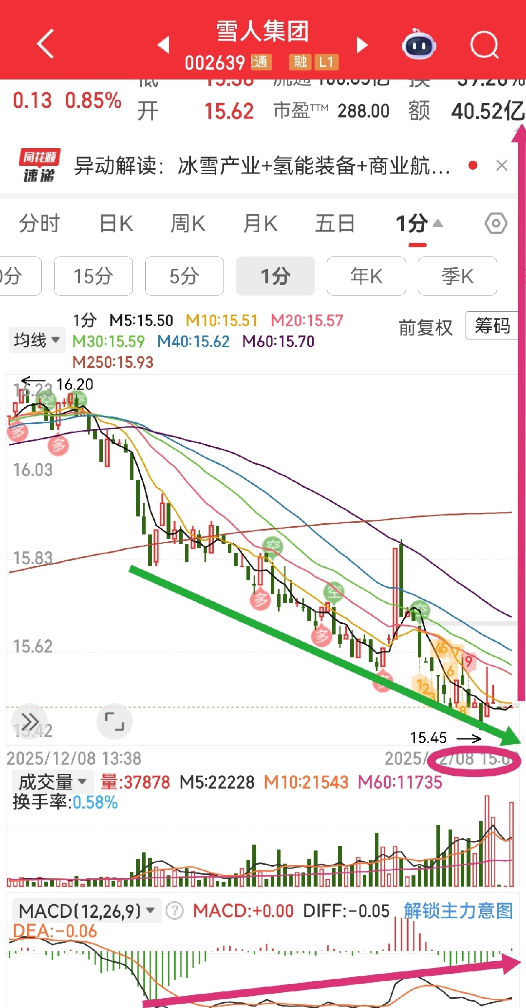 $雪人集团(SZ002639)$ 股价运行在智能撑压线之间,冲击压力位15.70元遇阻回落,收“射猎之星”!1分钟k线图,股价和macd出现下跌背离,后市对应会有1分钟级别的反弹!盼着再次放量突破压力位启动主升浪!