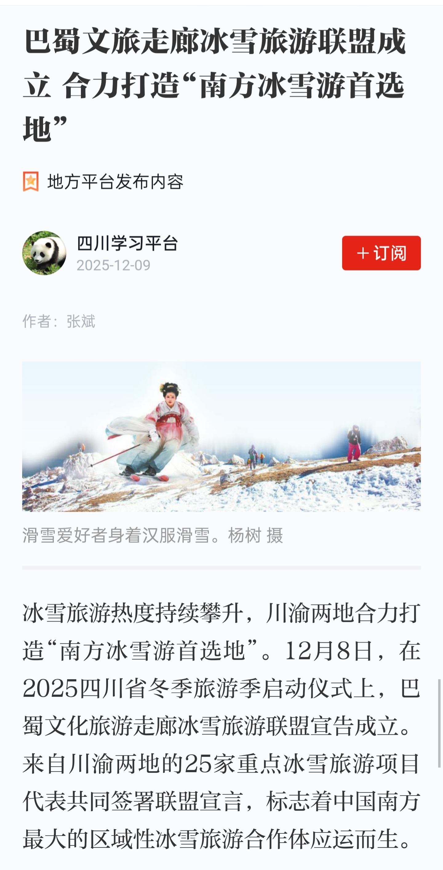 巴蜀文旅走廊冰雪旅游联盟成立打造“南方冰雪游首选地”
