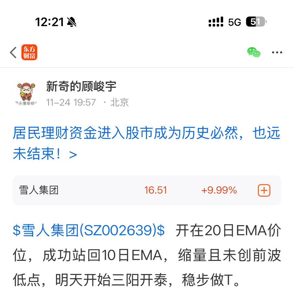 $雪人集团(SZ002639)$ 众所周知,一涨所谓专家涌现出来,跌的时候隐匿无踪影。我从11月跟踪到现在,十拿十稳,T无不胜。开盘告知晶雪吧友今日双双把家还。前面的三阳开泰,探底回升抓的明明白白。越发看不起涨一下就出现的“老师”,“高手”,你们成本比我低吗?