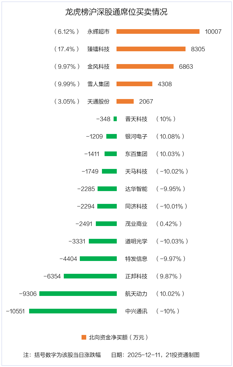 12月11日,北向资金参与龙虎榜中的个股共有17只,合计净卖出1.42亿元。其中沪股通净买入3 股,净卖出5 股,合计净买入3129万元;深股通净买入2 股,净卖出7 股,合计净卖出1.73亿元。