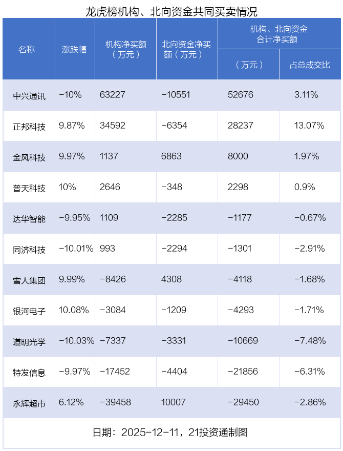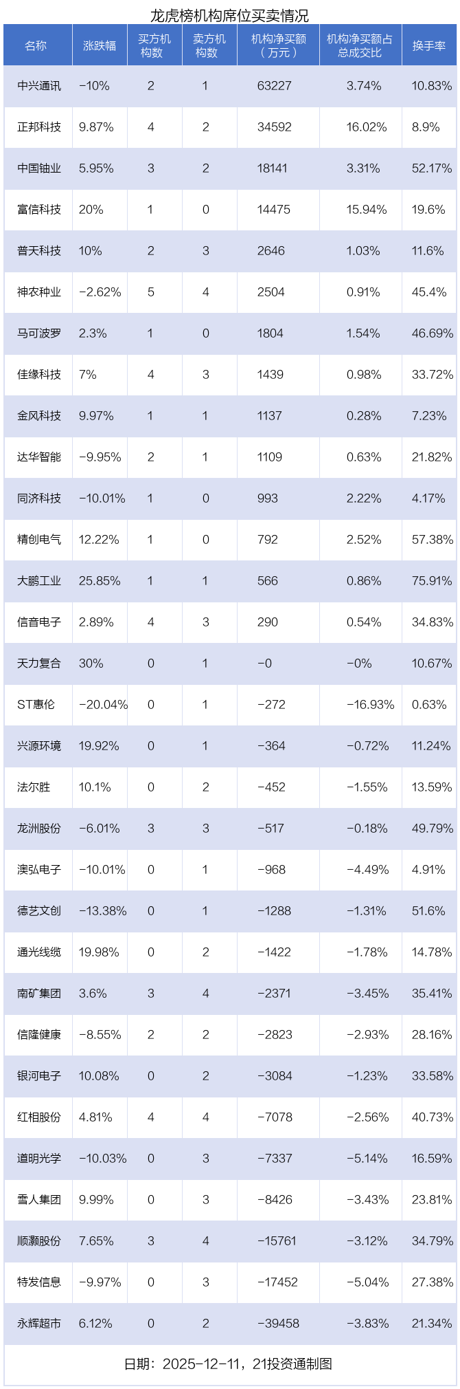 12月11日,31只个股龙虎榜出现了机构的身影,机构合计净买入3.46亿元。具体来看,机构净买入14股,净卖出17股。