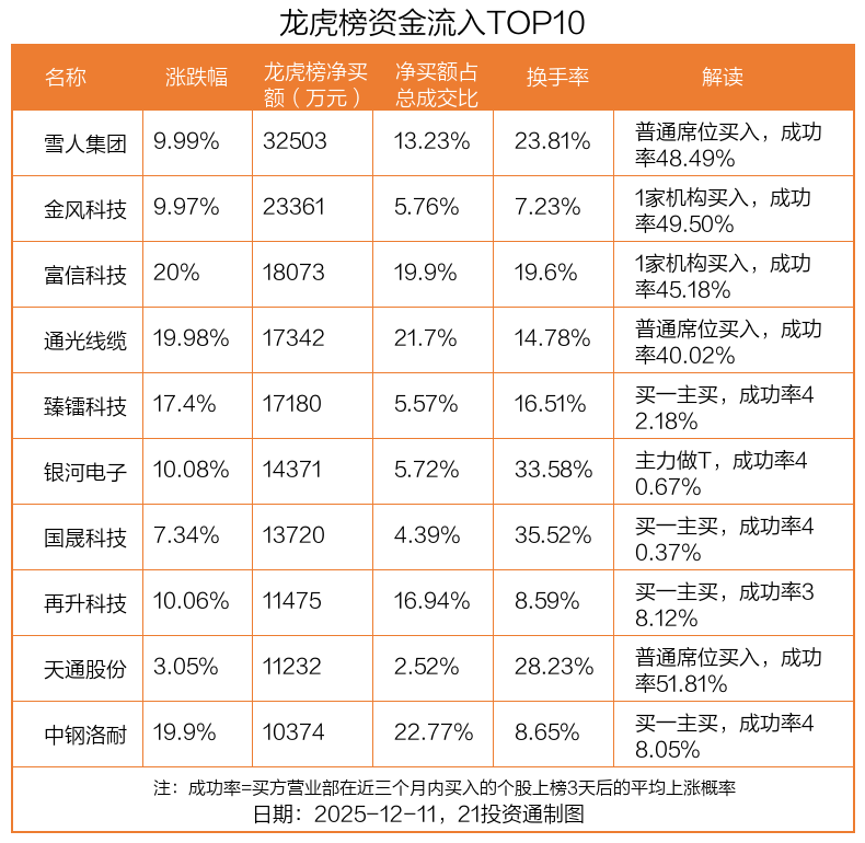 12月11日,上证指数下跌0.7%,深证成指下跌1.27%,创业板指下跌1.41%。盘后龙虎榜数据显示,共有55只个股因当日异动登上龙虎榜,资金净流入最多的是雪人集团(002639.SZ),达3.25亿元。