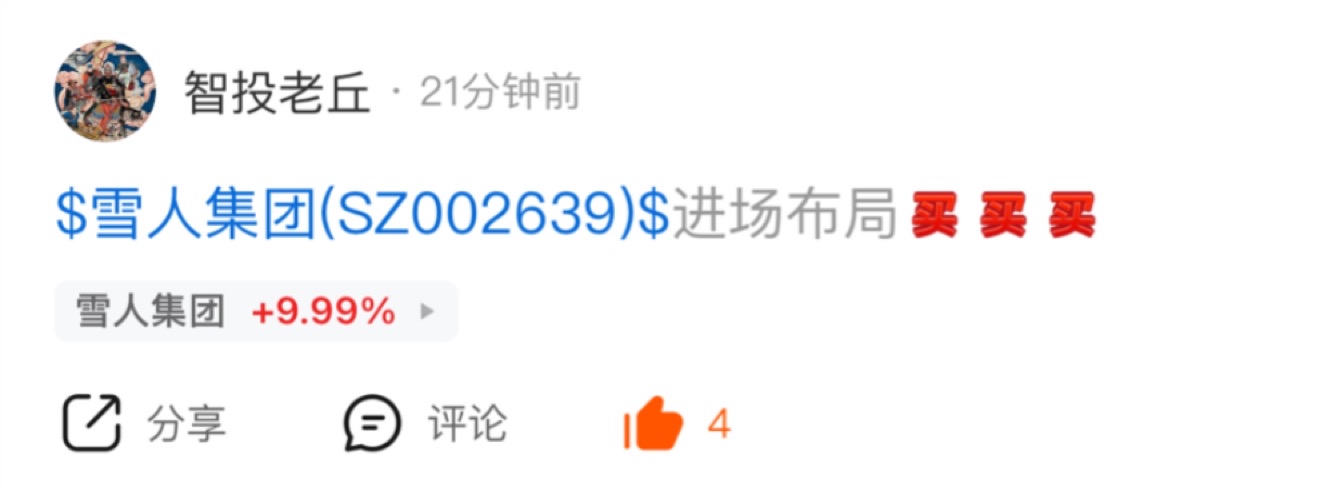 $雪人集团(SZ002639)$ 提前布局成功成功吃上涨停板,从不打马后炮,在这里也恭喜各位刚上车的朋友们,老丘这波提前布局和前瞻性怎么样值得一个点赞吗?