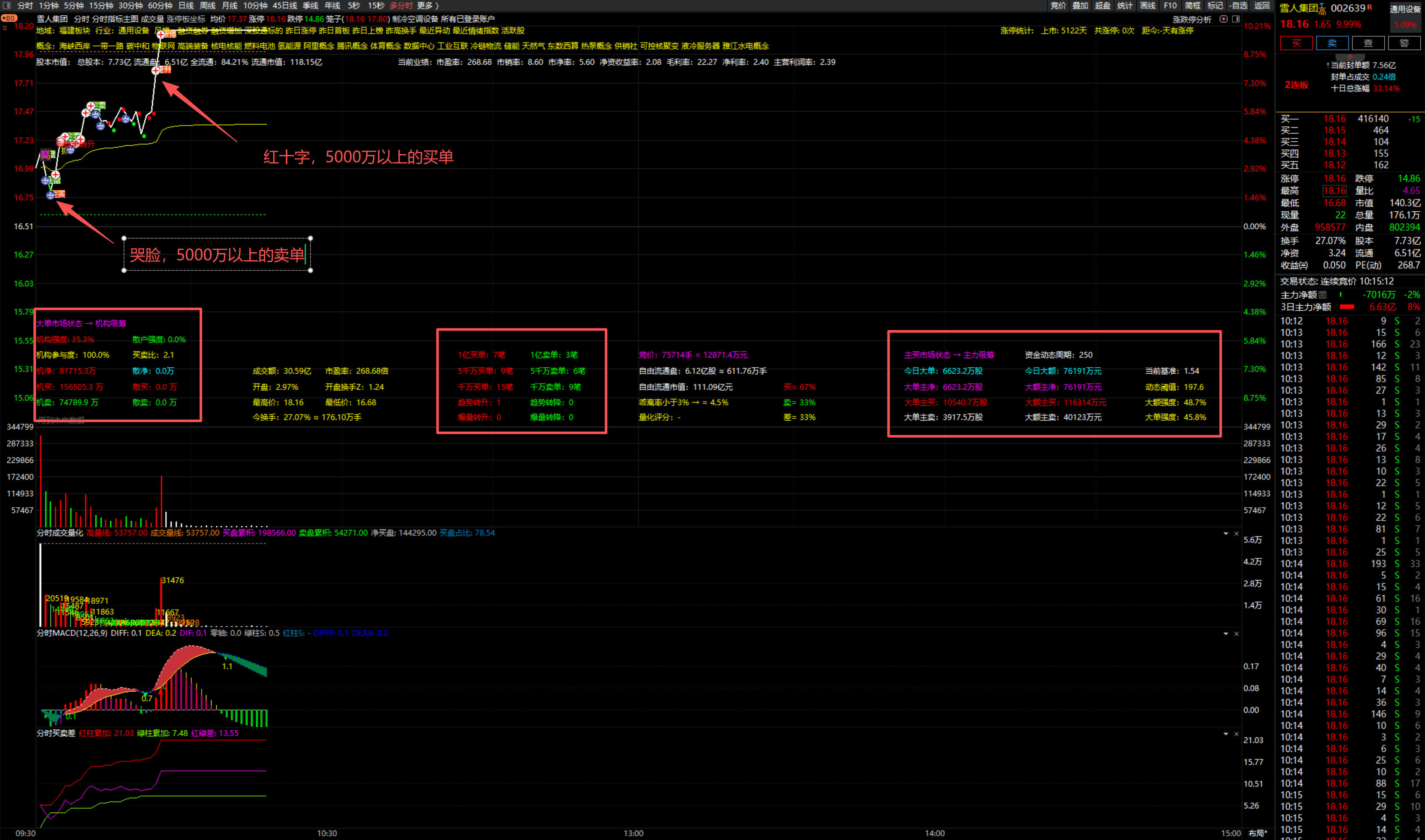 今天开盘时间段,估计是近期低点介入雪人的机会吧,开局5.73亿的成交量,随后又是一堆5千万、1千万的卖单砸下去一点,但更多的5千万、亿级买单承接,在一笔3.15亿的买单拉涨停了。