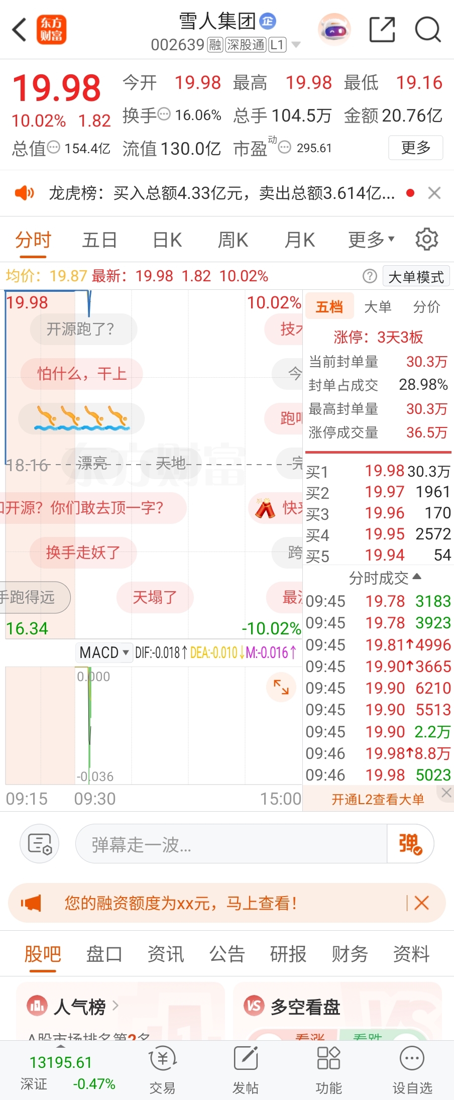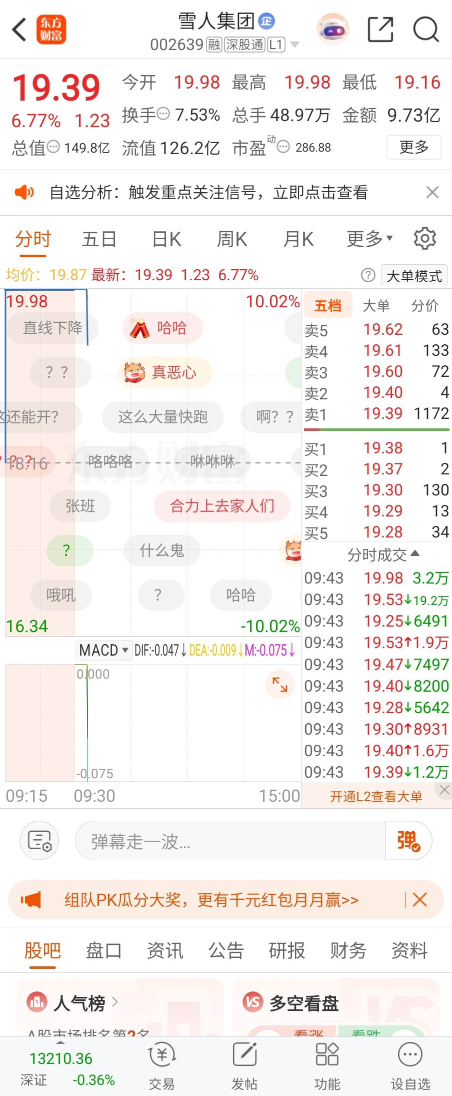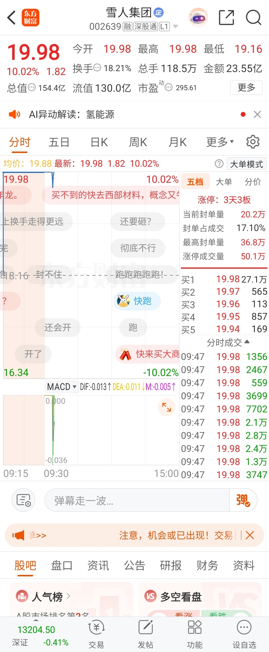$雪人集团(SZ002639)$ 充分换手才能走得更远。昨天就说了,不希望一字板,怎么说也是个T字板。连续一字板,后面再走一个板不就是更大的抛压?提前释放,才能更健康,该兑现的游资走了才能有新的游资介入,大家一起玩。格局,格局,格局放大,才能成妖!!是兄弟,就来雪人,做雪人兄弟!