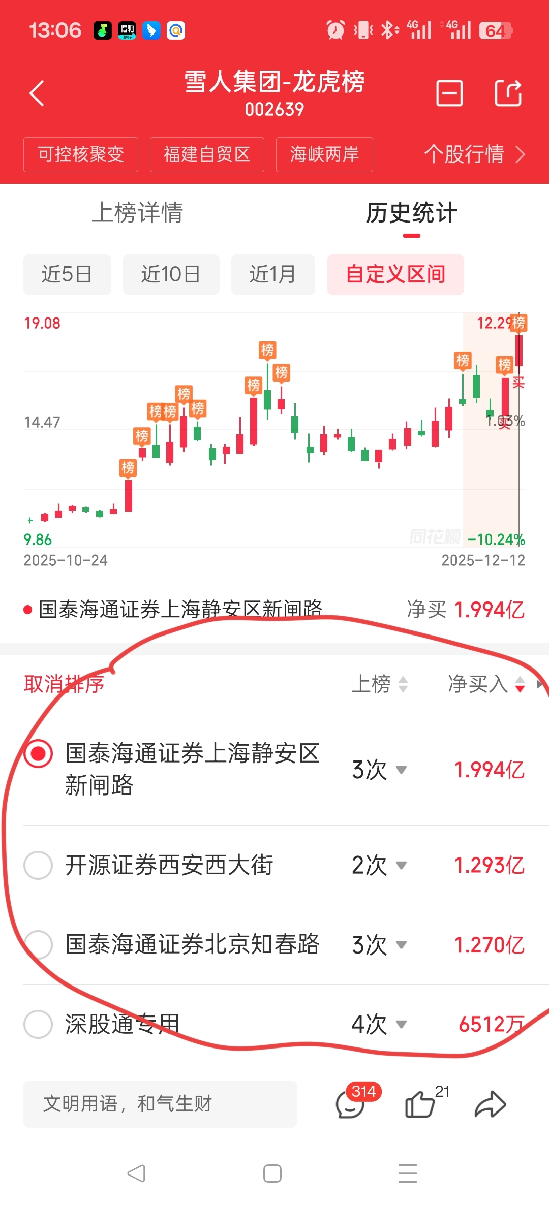 $雪人集团(SZ002639)$ 上周三天的榜!猜猜谁今天卖了